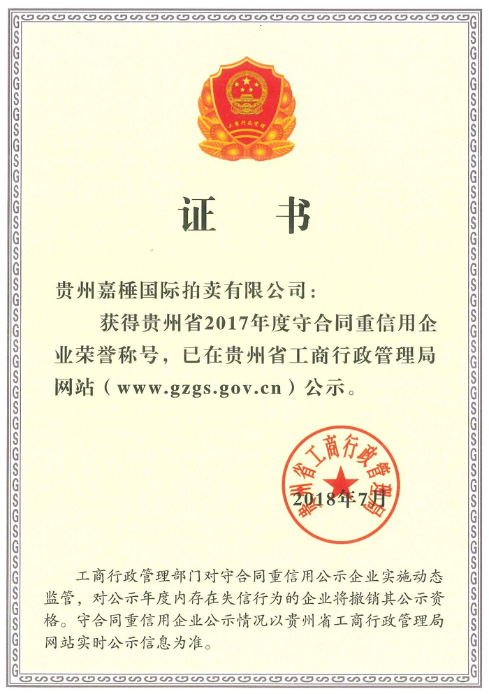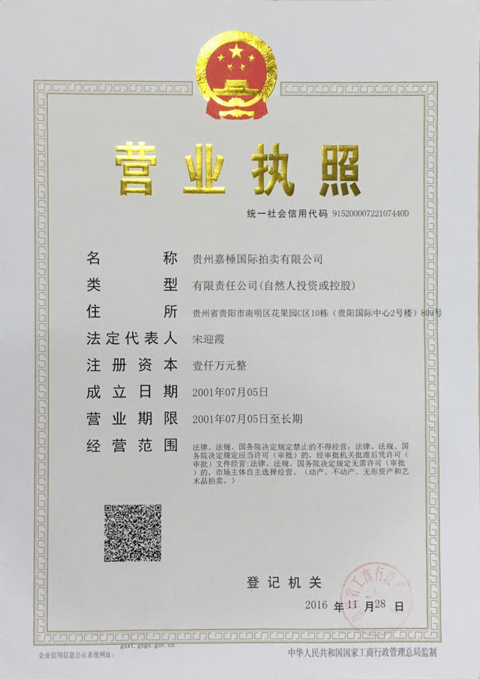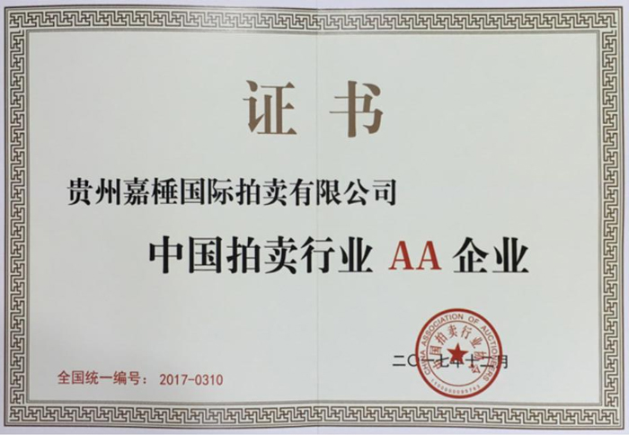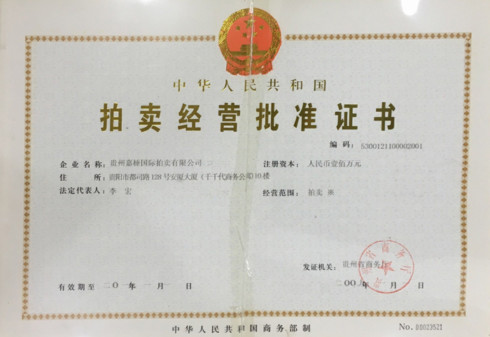 貴州嘉棰國(guó)際拍賣有限公司是主要從事動(dòng)產(chǎn)、不動(dòng)產(chǎn)、無(wú)形資產(chǎn)和文物藝術(shù)品拍賣業(yè)務(wù)的大型綜合性拍賣企業(yè),是中國(guó)拍賣行業(yè)協(xié)會(huì)會(huì)員,貴州省拍賣行業(yè)協(xié)會(huì)理事單位,中國(guó)拍賣行業(yè)協(xié)會(huì)AA級(jí)資質(zhì)企業(yè),貴州省連續(xù)十一年重合同守信用企業(yè),全省拍賣先進(jìn)企業(yè),貴州省公物拍賣人。公司充分利用多年來(lái)積累的客戶資源和全新的經(jīng)營(yíng)理念服務(wù)于貴州經(jīng)濟(jì)發(fā)展。同時(shí)也為貴州省國(guó)有企業(yè)的資產(chǎn)重組、改制改造以及不良資產(chǎn)的變現(xiàn),起到積極的作用。貴州嘉棰國(guó)際拍賣有限公司自成立以來(lái),多次成功地組織了房產(chǎn)、土地、機(jī)器設(shè)備和各種物資等標(biāo)的拍賣。并于2001年12月成為第一批貴州省高級(jí)人民法院及多家金融機(jī)構(gòu)指定的拍賣企業(yè)。 公司下設(shè)產(chǎn)權(quán)部、市場(chǎng)發(fā)展部、財(cái)務(wù)部、人事部和辦公室。現(xiàn)有員工11名,大專以上學(xué)歷員工占總數(shù)的90%,擁有精通業(yè)務(wù)的專門人才。有國(guó)家注冊(cè)拍賣師3名,公司工作人員大多參加過(guò)中國(guó)拍賣行業(yè)協(xié)會(huì)組織的從業(yè)資格培訓(xùn)。公司堅(jiān)持“客戶至上,執(zhí)業(yè)嚴(yán)謹(jǐn),公平競(jìng).....